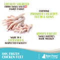 Made in USA. Ideal for Small to Medium Dogs. Frozen Raw. Single-ingredient: Chicken Feet! No Preservatives, additives, fillers, flavors, or colors. These skin-on chicken feet for dogs include the lower leg portion of the bird. There are approx (15) chicken feet per 2 lb bag.